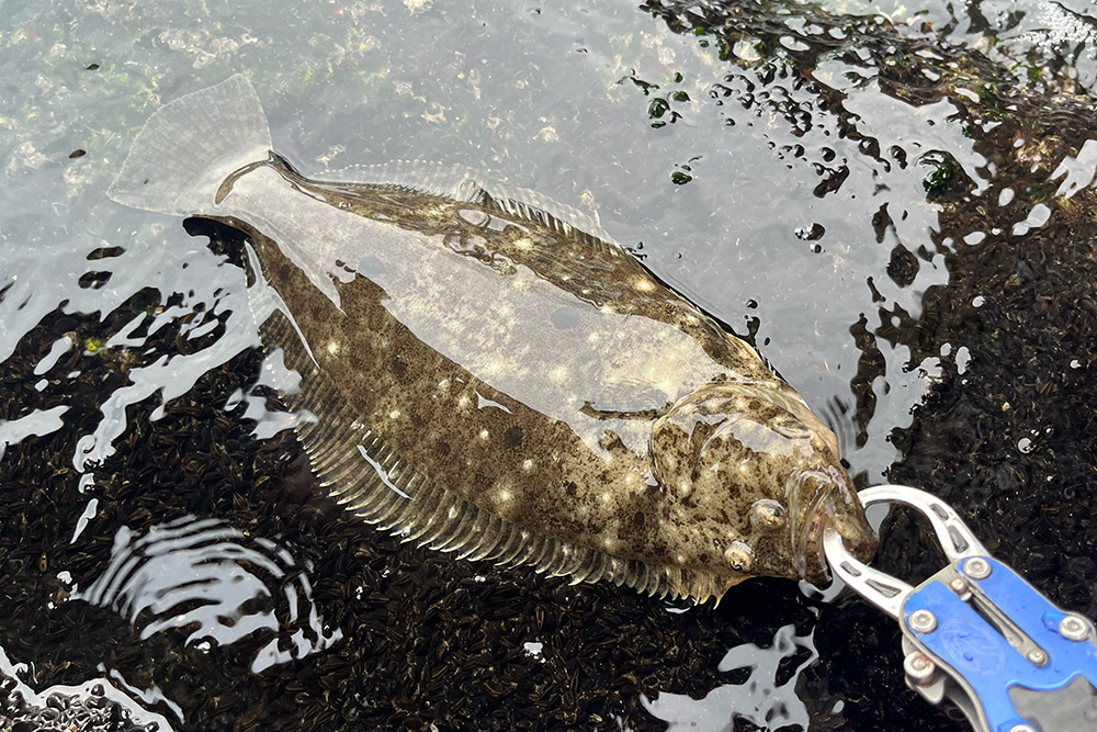 ガツンッと明確なアタリに思わずびっくりアワセになってしまいましたが、なんとかフッキングも決まり、落ち着いて手繰り寄せると、まさかのヒラメ。