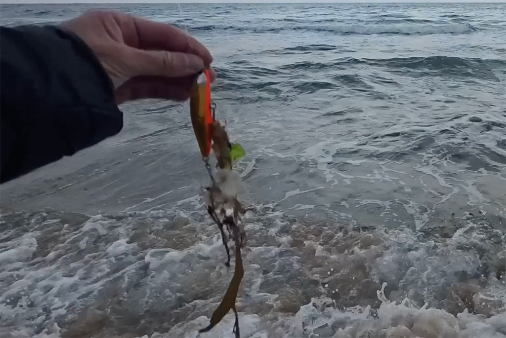そしてメガバスの「カゲロウ 100F」で表層をユラユラとアクションさせていると、足元の波打ち際でグンッとロッドが絞り込まれました。